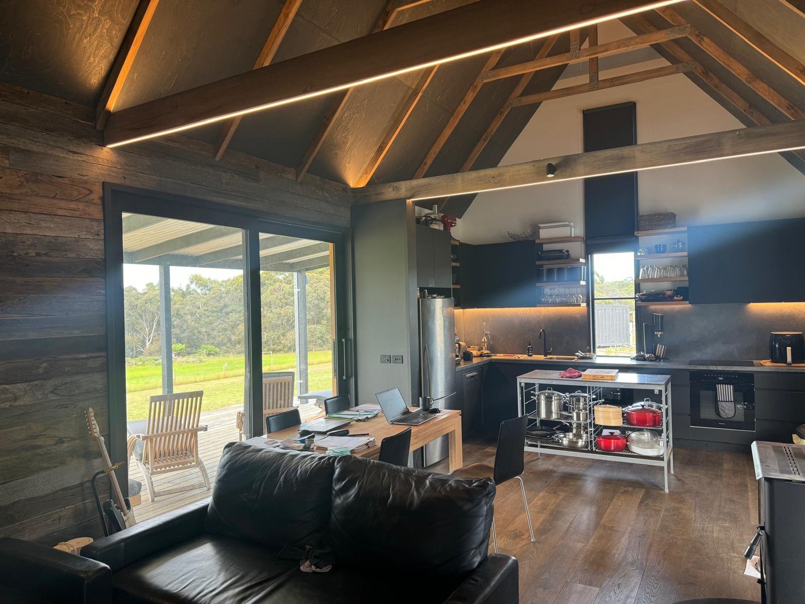 The house is fossil fuel free, with both space heating and hot water demand met by air source heat pump. A photovoltaic panel array and storage battery provide renewable electricity. An MVHR system supplies fresh, filtered air throughout the house.